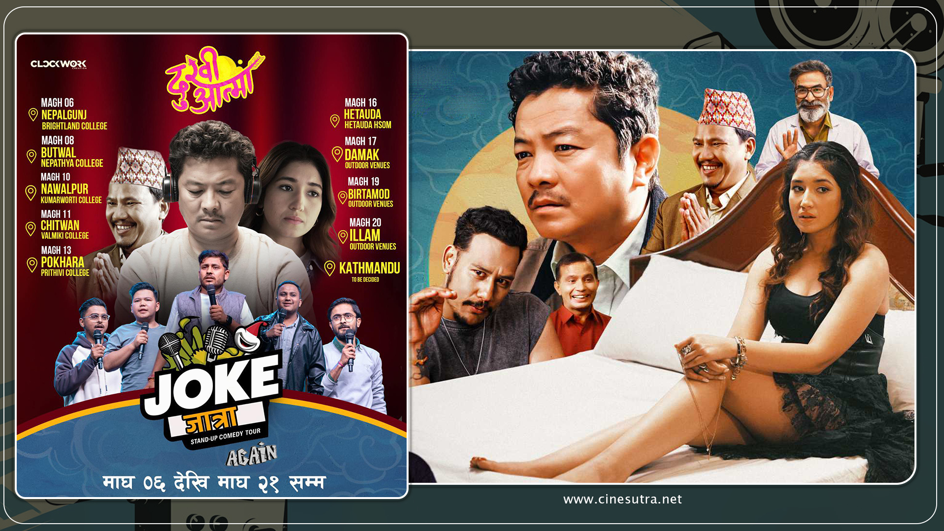 अब, सिनेमाको टिमले नाम चलेका केही कमेडियनहरुसँग सहकार्य गर्दै ‘जोक जात्रा’ कार्यक्रम आयोजना गर्ने भएको छ । यो टुर देशका विभिन्न १० शहरमा हुनेछ ।