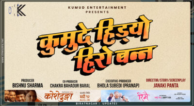 सिनेसुत्र, बिराटनगर- नेपाली कथान सिनेमा “कुमुदे हिड्यो हिरो बन्न” निर्माण हुने भएको छ । शाहीत्यकार तथा गीतकार जानकी पन्त जुनको डेब्यु निर्देशन रहने यस सिनेमामा एउटा पात्र जो जिन्दगीमा हरेक कुरामा हिरो बन्न चाहन्छ, उसैको कथामा सिनेमा रहने निर्माण पक्षले जानकारी दिएको छ । कुमुद इन्टरटेन्टमेन्टको ब्यानरमा निर्माण हुने यस सिनेमाका निर्माता हुन् बिष्णु पन्त … Continue reading जानकी पन्त जुनको निर्देशनमा नयाँ सिनेमा ‘कुमुदे हिड्यो हिरो बन्न’ निर्माण घोषणा