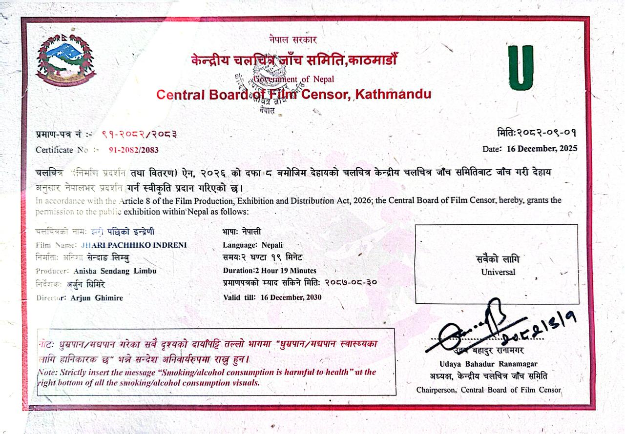 सिनेसुत्र, बिराटनगर- पौष ४ गते अर्थात् आगामी शुक्रबारबाट देशव्यापी प्रदर्शनमा आउने सिनेमा ‘झरीपछिको इन्द्रेणी’ सेन्सर पास भएको छ। सिनेमा जाँच पास समिति (सेन्सर बोर्ड)बाट यो सिनेमाले युनिभर्सल सर्टिफिकेट पाएको हो। युनिभर्सल सर्टिफिकेट पाएसँगै अब यो सिनेमा हरेक उमेर समूहका दर्शकले सजिलै हेर्न पाउने भएका छन्।