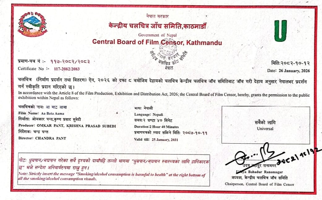 सिनेसुत्र, बिराटनगर- यही माघ १६ गतेबाट प्रदर्शनमा आउने सिनेमा ‘आ बाट आमा’ सेन्सर पास भएको छ। सोमबार केन्द्रीय चलचित्र जाँच पास समिति (सेन्सर बोर्ड)बाट युनिभर्सल सर्टिफिकेट पाएसँगै सिनेमा सेन्सर पास भएको हो।